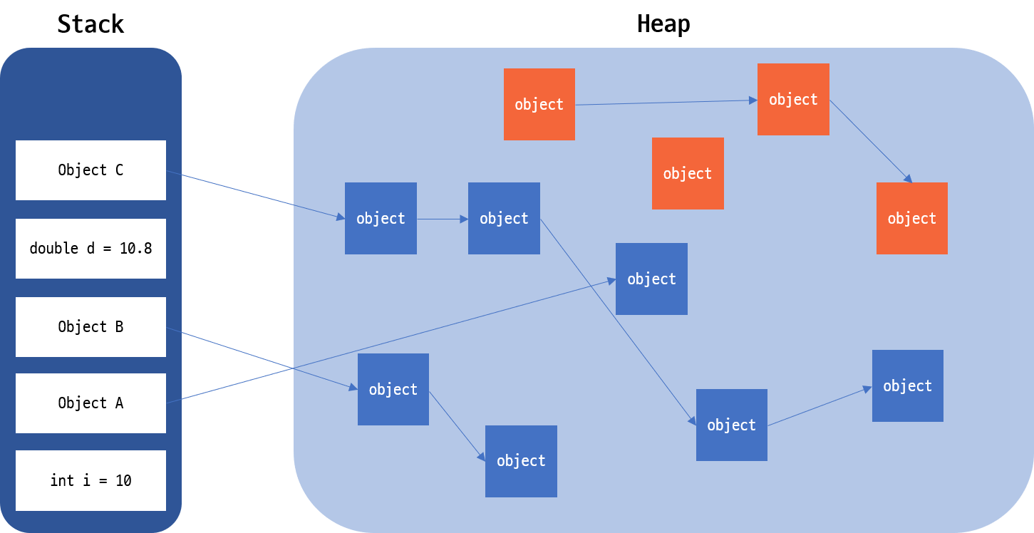 객체로 선언된 변수의 경우 힙 메모리에 할당된 객체의 주소를 가리키는 포인터의 역할이다. 그래서 객체 변수의 역할을 모두 끝내고 사라지더라도 힙 메모리에 할당된 객체들은 그대로 남아있게 된다. 객체의 주솟값을 가지고 있는 변수가 없으면 가비지 컬렉션은 접근할 수 없는 객체(Garbage)라고 판단한다.