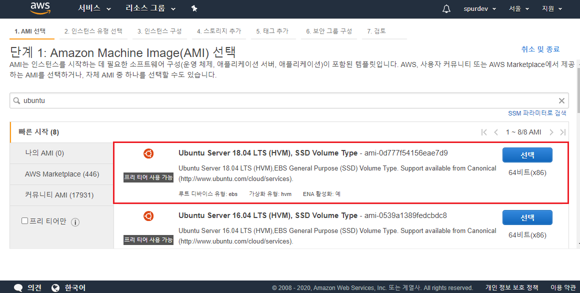 1. Amazone Machine Image(AMI) 선택 - 해당 인스턴스에서 어떤 OS를 사용할건지 선택한다.