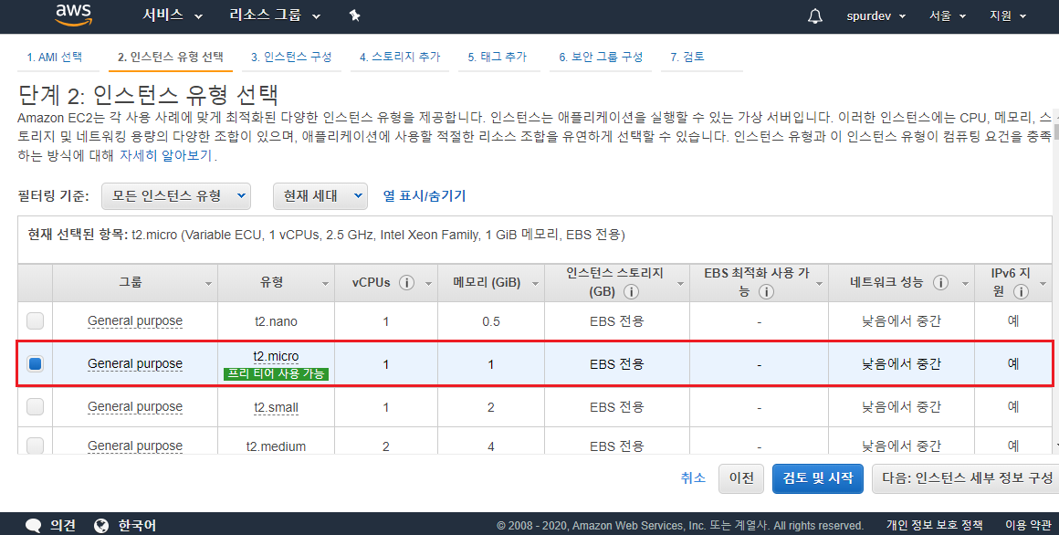 2. 인스턴스 유형 선택 - EC2에 할당할 자원을 선택한다.