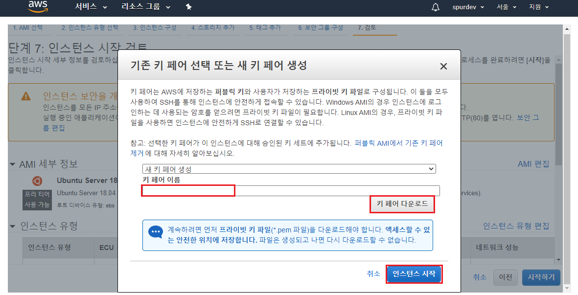 키 페어 이름에 적당한 이름을 적고 키 페어 다운로드를 클릭한다.