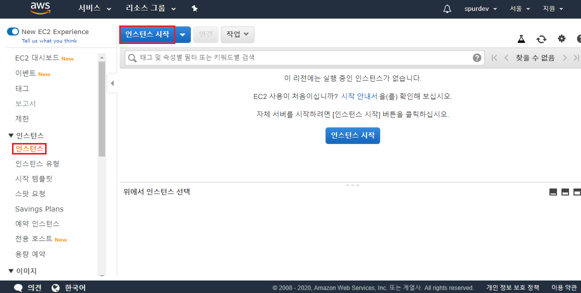 좌측 메뉴에서 인스턴스로 들어오면 인스턴스를 생성할 수 있다.