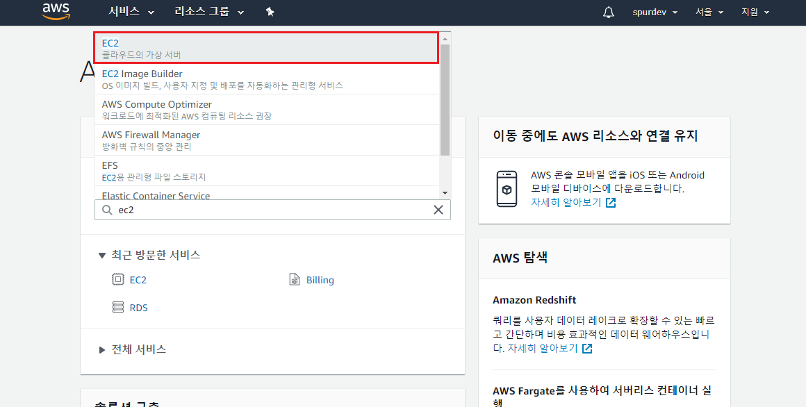 콘솔에 로그인 후 검색에 EC2를 검색하여 클릭하면 EC2 대시보드로 들어간다.