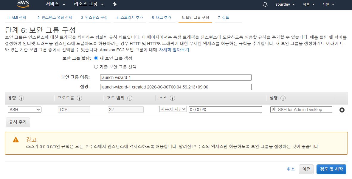 자신만 사용하고 싶다면 0.0.0.0/0 부분을 자신의 IP로 변경해 주면 된다. 나는 사용할 때만 인스턴스를 동작시키고 사용이 끝나면 중지 시킬 생각이기 때문에 따로 설정하진 않았다. 마지막 설정이 끝났다면 검토 및 시작을 누른다.