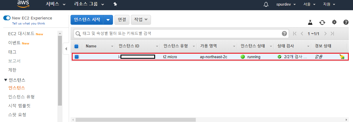 인스턴스 페이지로 돌아오면 위와 같이 인스턴스가 생성된것을 확인할 수 있다.