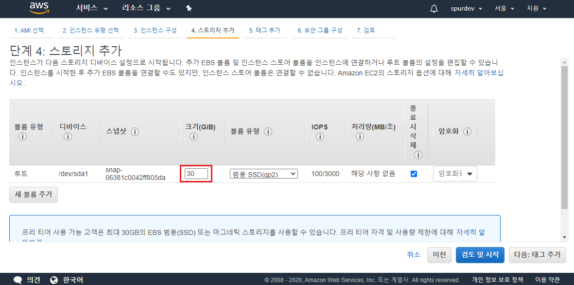 3. 스토리지 추가 - EC2의 저장공간 설정(3단계 인스턴스 구성은 설정할게 없으니 그대로 다음)
